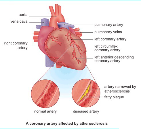 โดยส่วนใหญ่แล้ว โรคหลอดเลือดหัวใจมักเกิดจากไขมันและเนื้อเยื่อสะสมในผนังของหลอดเลือด ทำให้เยื่อบุผนังหลอดเลือดชั้นในตำแหน่งนั้นหนาตัวขึ้น หลอดเลือดจึงมีการตีบแคบลงทำให้เลือดซึ่งนำออกซิเจนไหลผ่านได้น้อยลง ส่งผลให้เลือดไหลไปเลี้ยงกล้ามเนื้อหัวใจได้ไม่เพียงพอ จนเกิดภาวะกล้ามเนื้อหัวใจขาดเลือด ซึ่งจะทำให้มีอาการเจ็บหน้าอกเกิดขึ้น